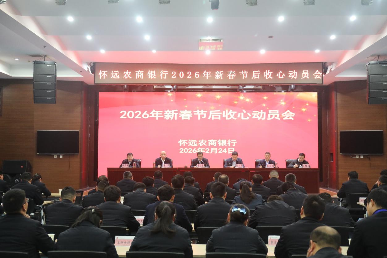 2月24日下午,怀远农商银行召开2026年春节假期后收心会。会议由党委副书记、行长翟永平主持,领导班子成员,中层正副职,各网点、各部门负责参加会议。