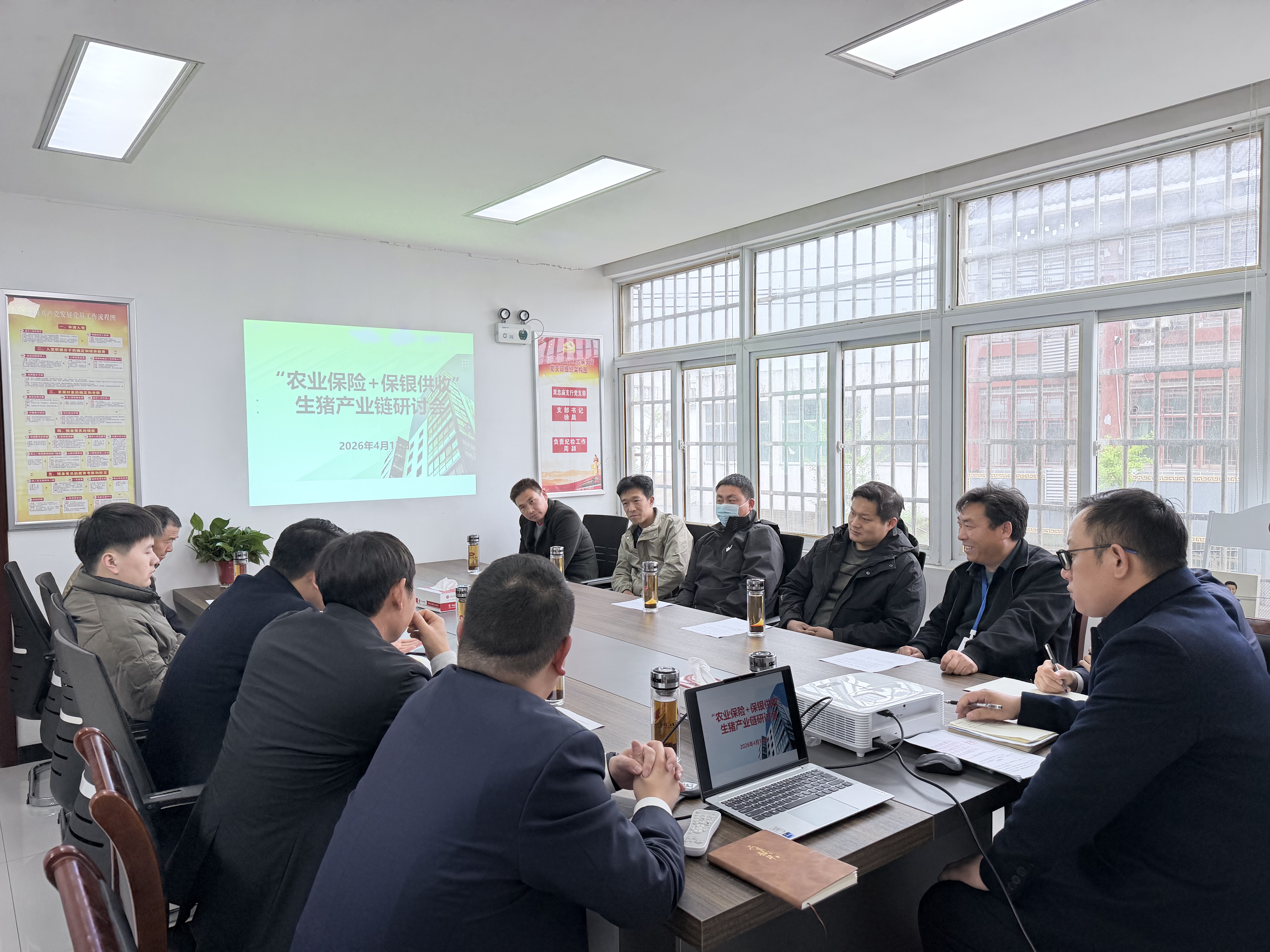 4月13日,五河县财政局、五河县农业农村局、国元保险五河县支公司联合五河农商银行双忠庙支行,共同召开“农业保险+保银供收”生猪产业链专题研讨会。