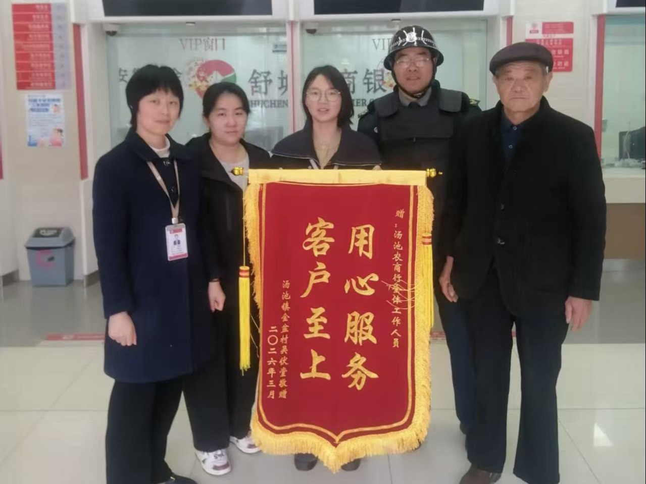 3月15日上午,舒城县汤池镇金盆村的吴大爷专程来到舒城农商银行汤池支行,将一面印有“客户至上,用心服务”的锦旗送到工作人员手中,对支行长期以来的贴心关照、优质高效的金融服务表示高度认可与衷心感谢。