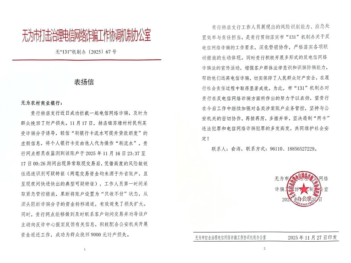 “要不是你们反应快,我这经营的钱就要出问题了!”近日,无为市赫店镇苏塘村村民利某紧紧握住无为农商银行赫店支行工作人员的手,语气里满是感激。正是该支行柜员的“火眼金睛”与果断处置,成功拦截了一起电信网络诈骗,为他挽回9000元财产损失。