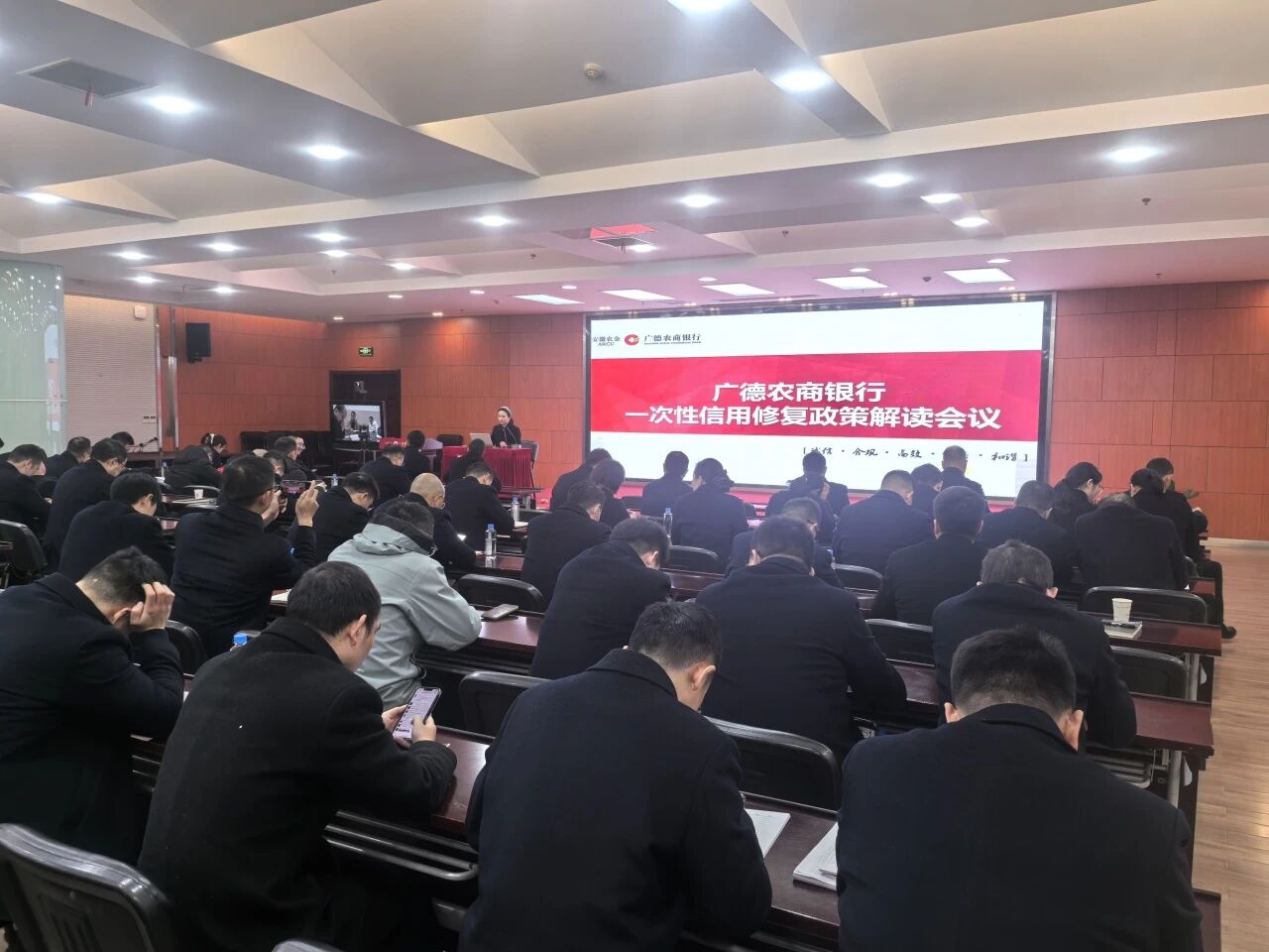 为落实好一次性信用修复政策,规范工作人员服务指引,1月7日晚,广德农商银行开展一次性信用修复政策专题培训会议。培训采取“主会场+视频分会场”形式,全行分支机构负责人、前台业务人员及部分客户经理共计158人在主会场参会,其余网点人员通过视频连线在各分会场同步参训。