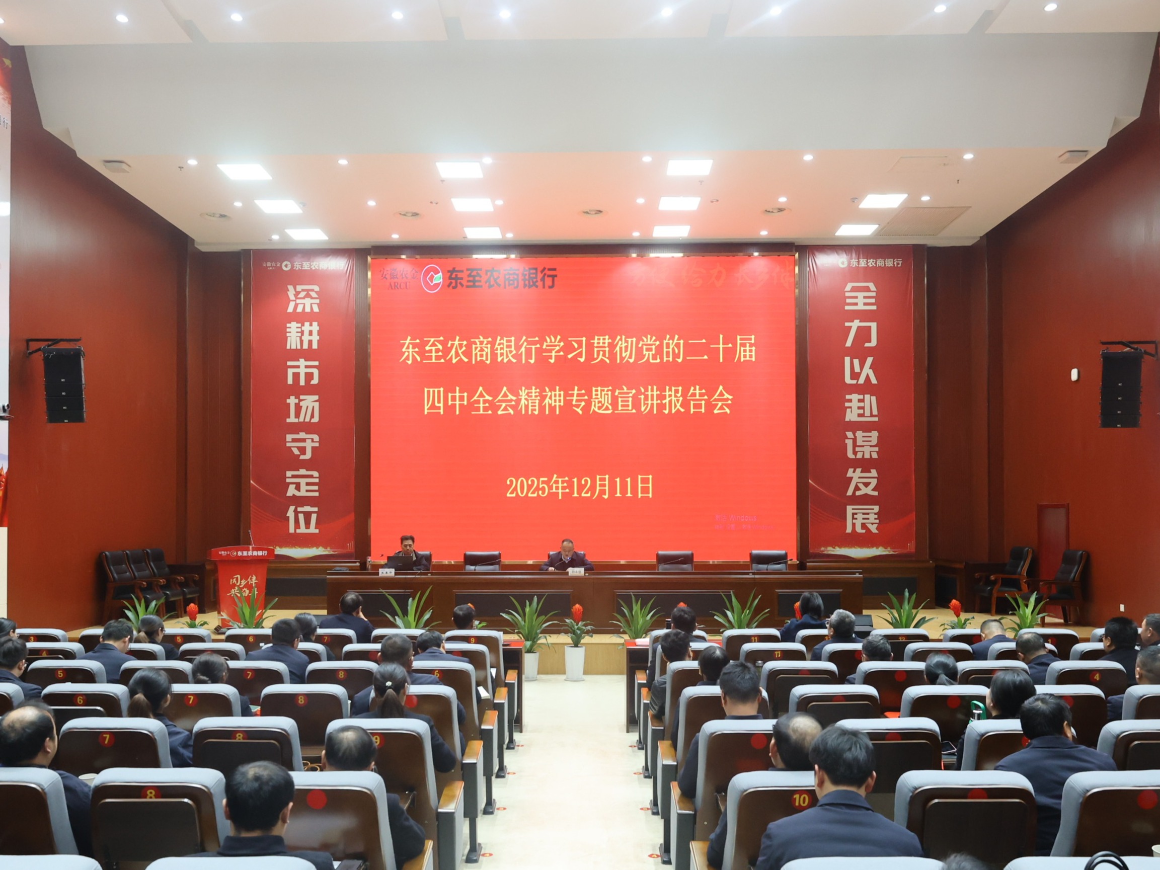 12月11日,东至农商银行召开学习贯彻党的二十届四中全会精神专题宣讲报告会,邀请市委宣讲团成员、市委党校(池州行政学院)副校长朱春泽宣讲。行党委副书记、行长詹永忠主持会议,行党委班子成员,中层正副职及部分党员参加了会议。