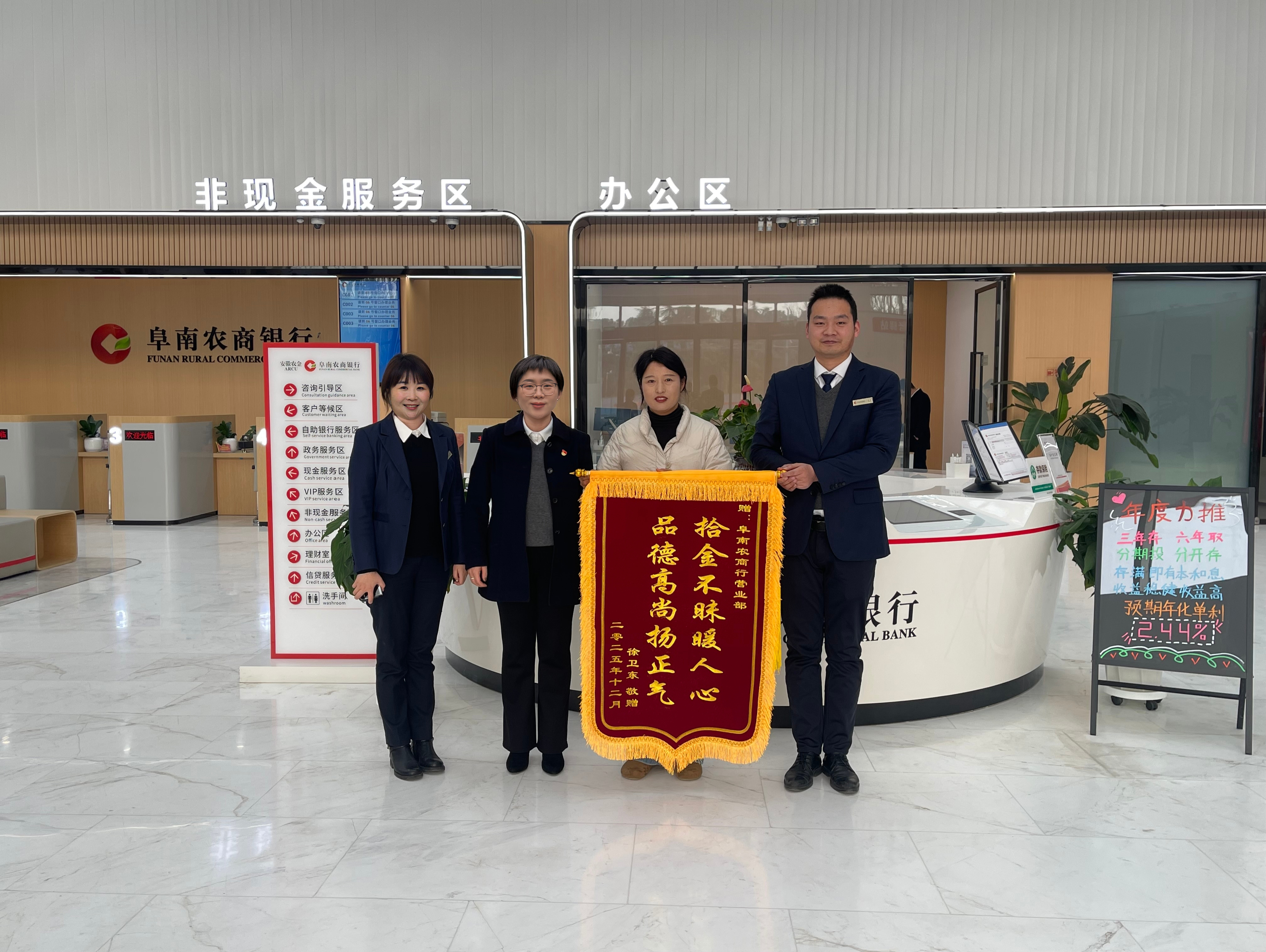 这面锦旗不仅是对该行员工拾金不昧行为的表扬,更是对阜南农商银行整体服务与社会形象的充分肯定。阜南农商银行将继续以客户满意为导向,不断提升服务品质,积极履行社会责任,持续擦亮“阜南人自己的银行”这一金字招牌,为市民提供更加温暖、安全、高效的金融服务。(王浩然)