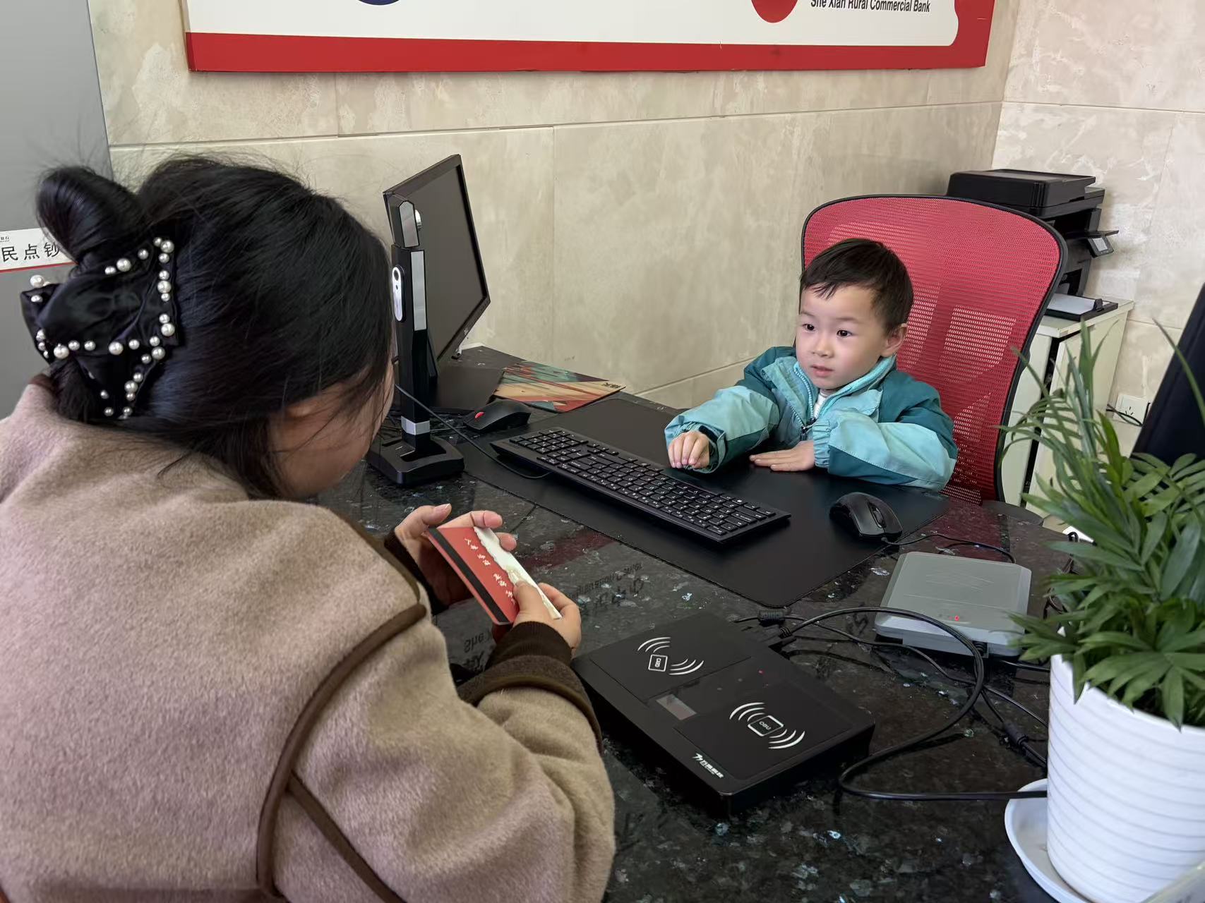 在工作人员的带领下,孩子和家长们还依次参观了取号机、智能柜员机、回单机等设备,对银行的日常运作有了初步的认知。