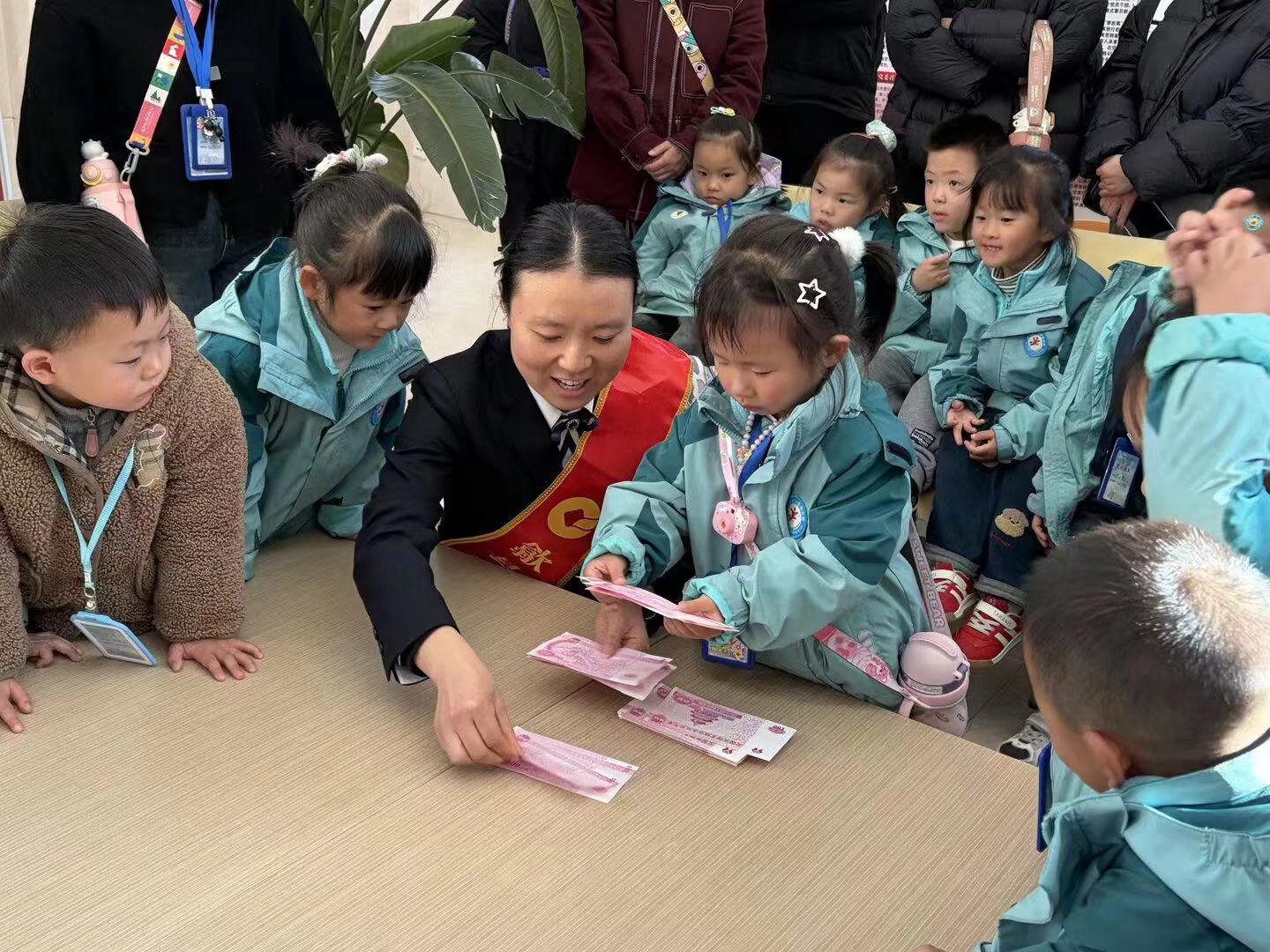 金融知识小课堂在孩子们的欢声笑语中拉开帷幕,银行工作人员通过实物展示、趣味问答等方式,教孩子们认识纸币上的数字、图案和颜色,区分100元、50元、20元等不同面额的人民币。工作人员还用通俗易懂的语言介绍了人民币的防伪特征,教会孩子和家长们通过“一看、二摸、三听、四测”的鉴别技巧来辨别假币。