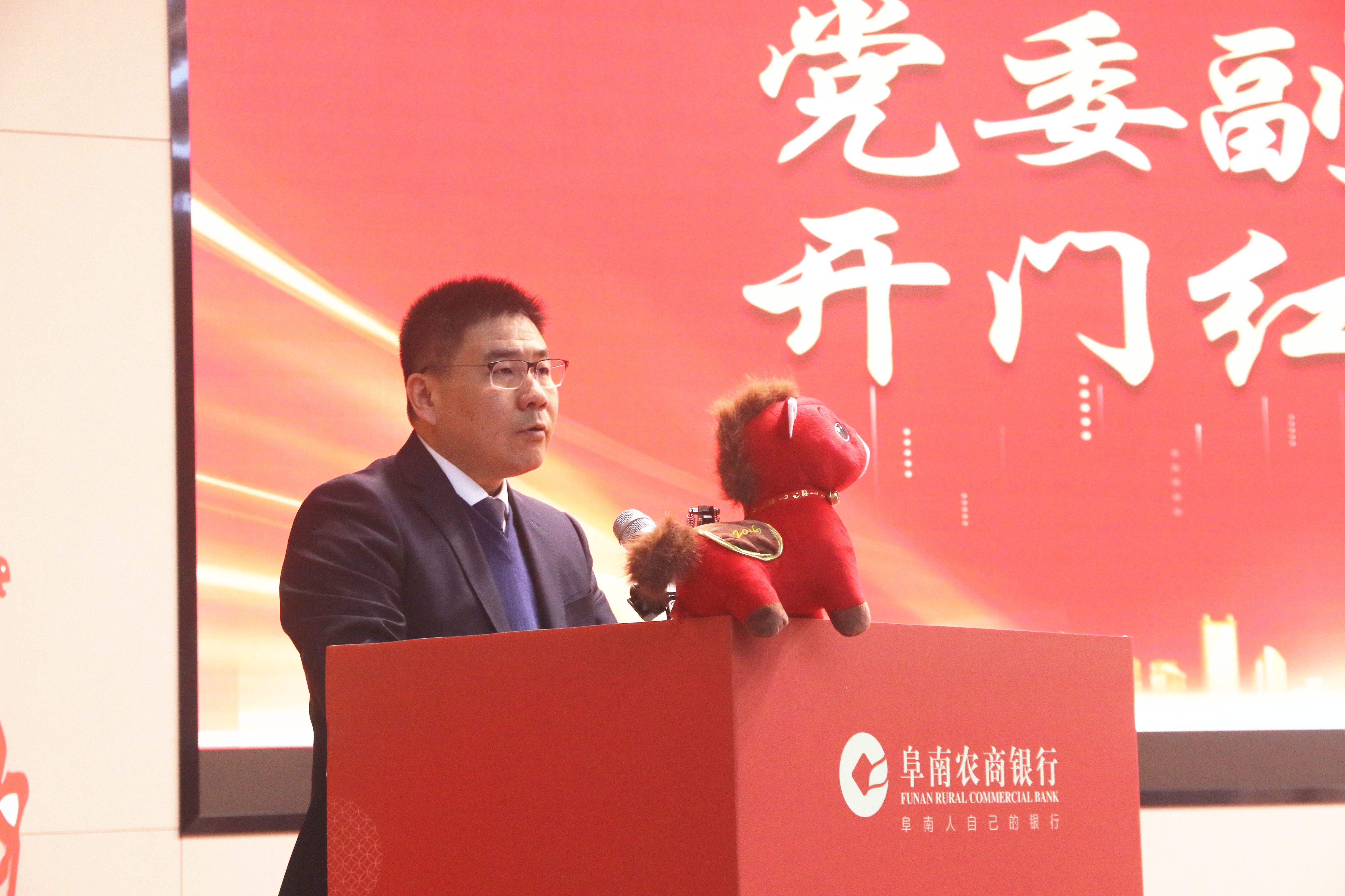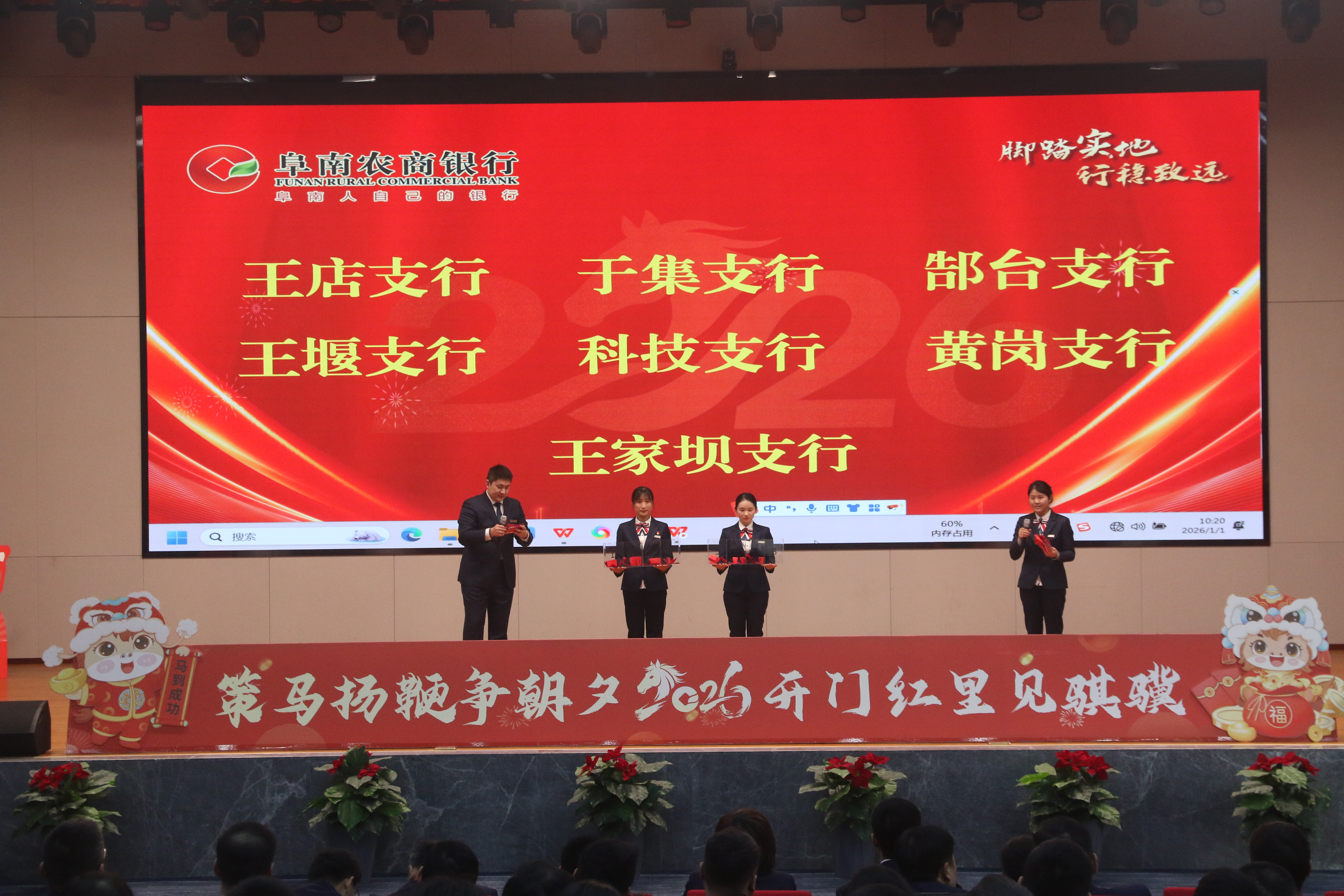策马扬鞭争朝夕,开门红里见骐骥!为全面部署2026年旺季营销工作,鼓舞全员士气,坚定必胜信心,1月1日上午,阜南农村商业银行2026年“开门红”旺季营销启动大会顺利举行。行领导班子成员、各支行行长、部门负责人、全体客户经理及各岗位员工代表齐聚一堂,共同吹响新征程的奋进号角。