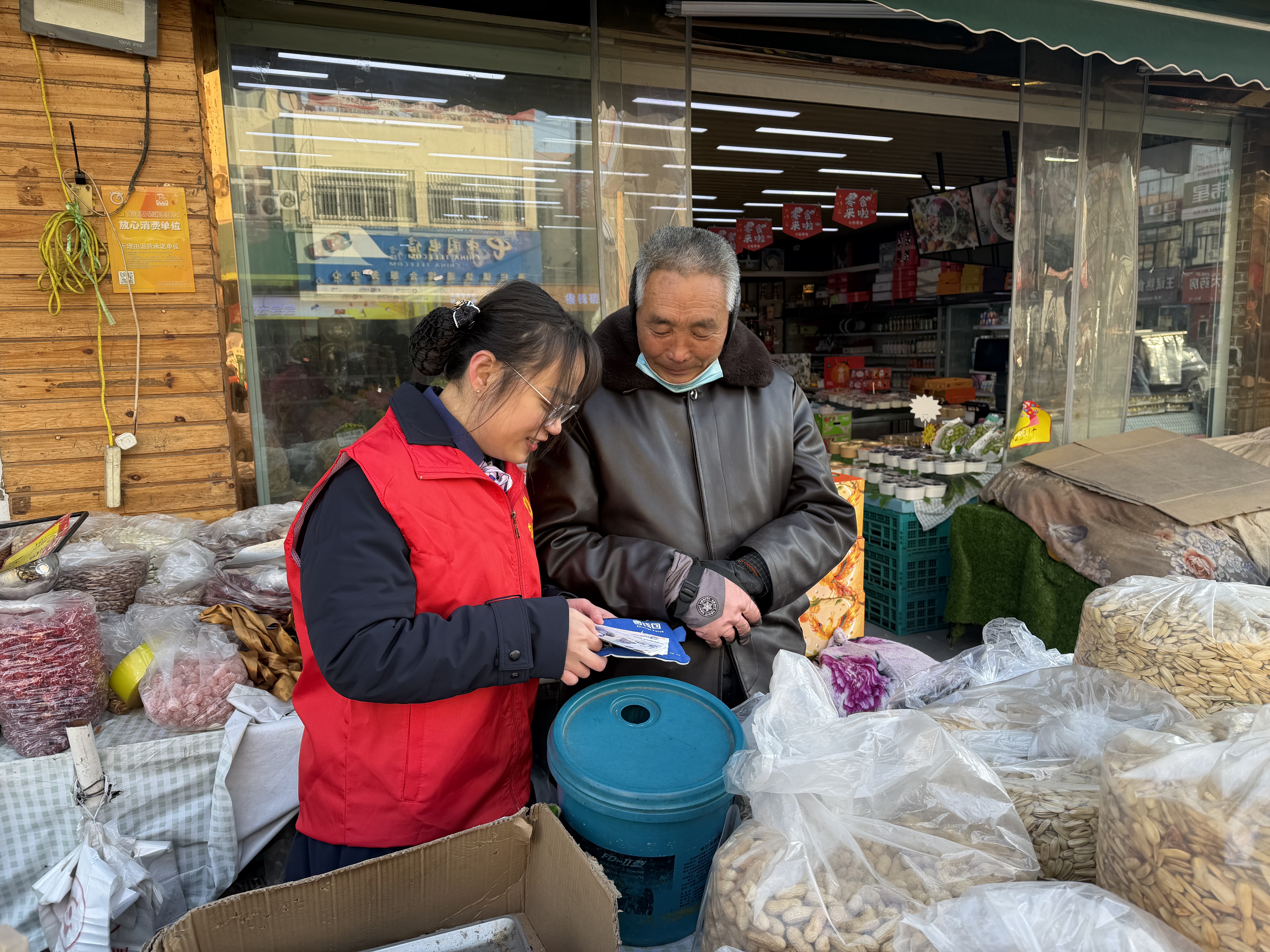 秦栏镇的集市上,火红的春联、喷香的炒货、鲜活的鱼虾挤满了街道,吆喝声、笑语声、讨价声交织如歌。身穿红色马甲的工作人员穿梭在人流中,他们不仅带着移动终端现场办理业务,更揣着一个个精心准备的“零钱包”——5元、10元、20元的新钞专为习惯现金交易的老人家准备。