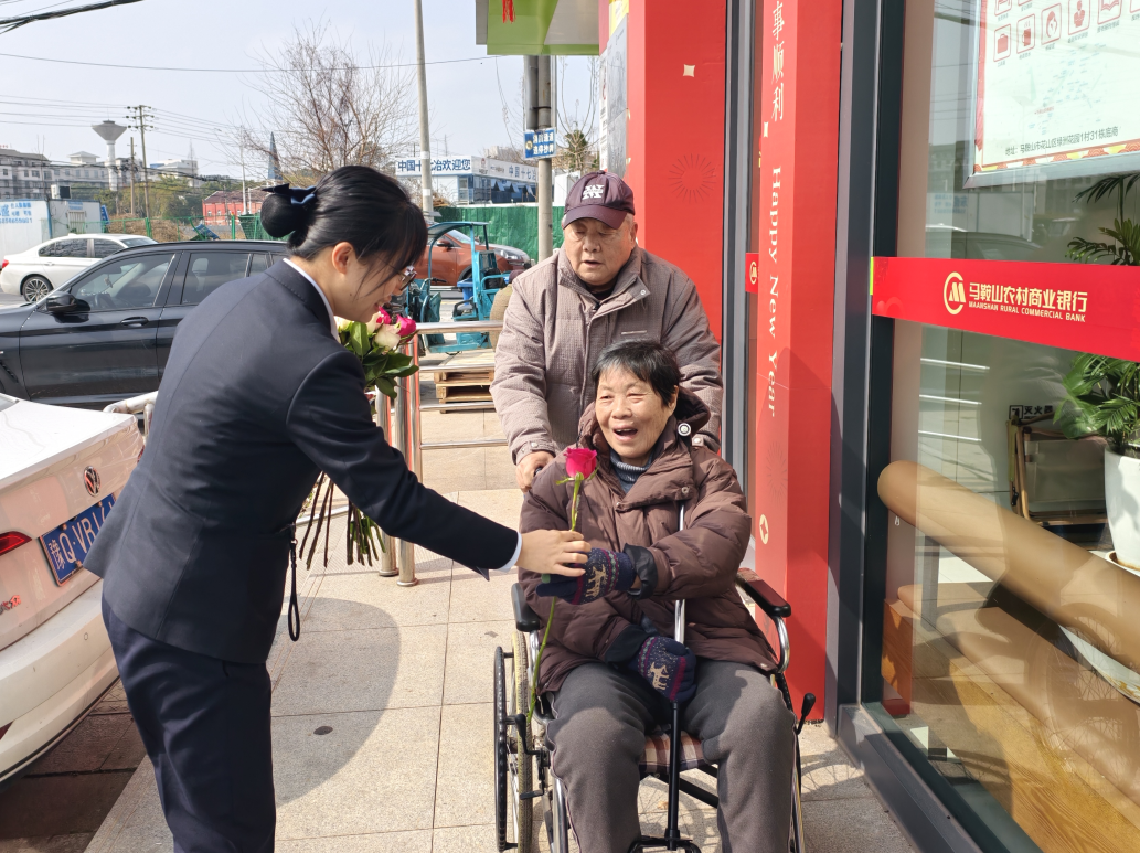 关怀不止于内部,温暖更要送出去。高新区支行工作人员带着精心准备的鲜花,先后走访慰问了坚守岗位的环卫工人、超市员工等基层女性工作者,以及前来办理业务的女性客户,向她们致以节日的美好祝福和诚挚敬意。一句句暖心的问候,一束束芬芳的鲜花,不仅让平凡岗位上的“她力量”被看见、被尊重、被关爱,更用实际行动践行了马鞍山农商银行扎根本土、服务民生的责任与担当。