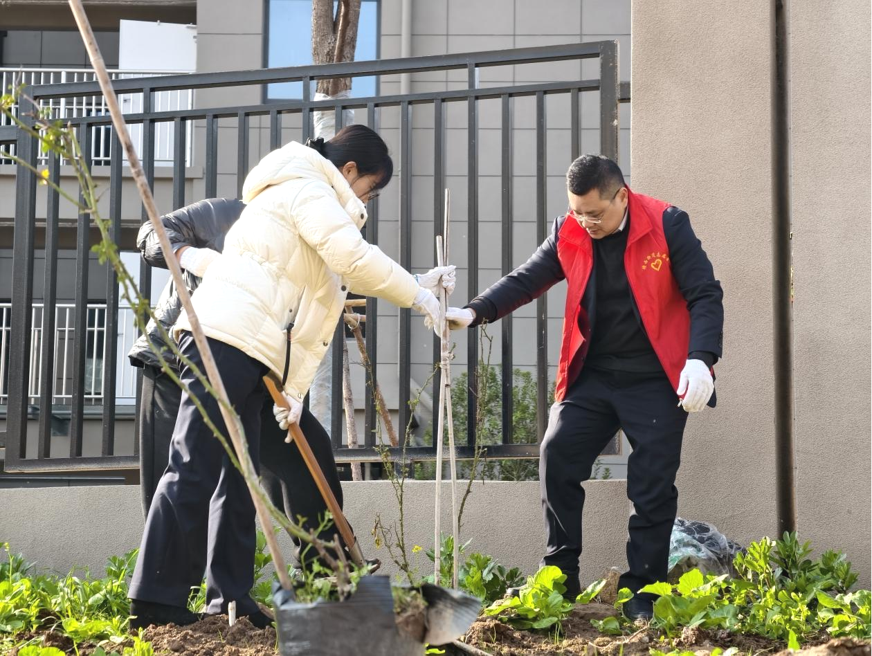 高新区支行党支部联合金安社区党委,共同举办“共植藤蔓绿,同筑幸福墙”植树节主题活动。支行党员志愿者、社区工作人员与居民代表齐聚现场,分工协作、挥锹铲土、扶苗浇水,每一道工序都一丝不苟,以实际行动为社区增添新绿,让“党建红”引领“生态绿”,以银社同心共筑幸福社区。