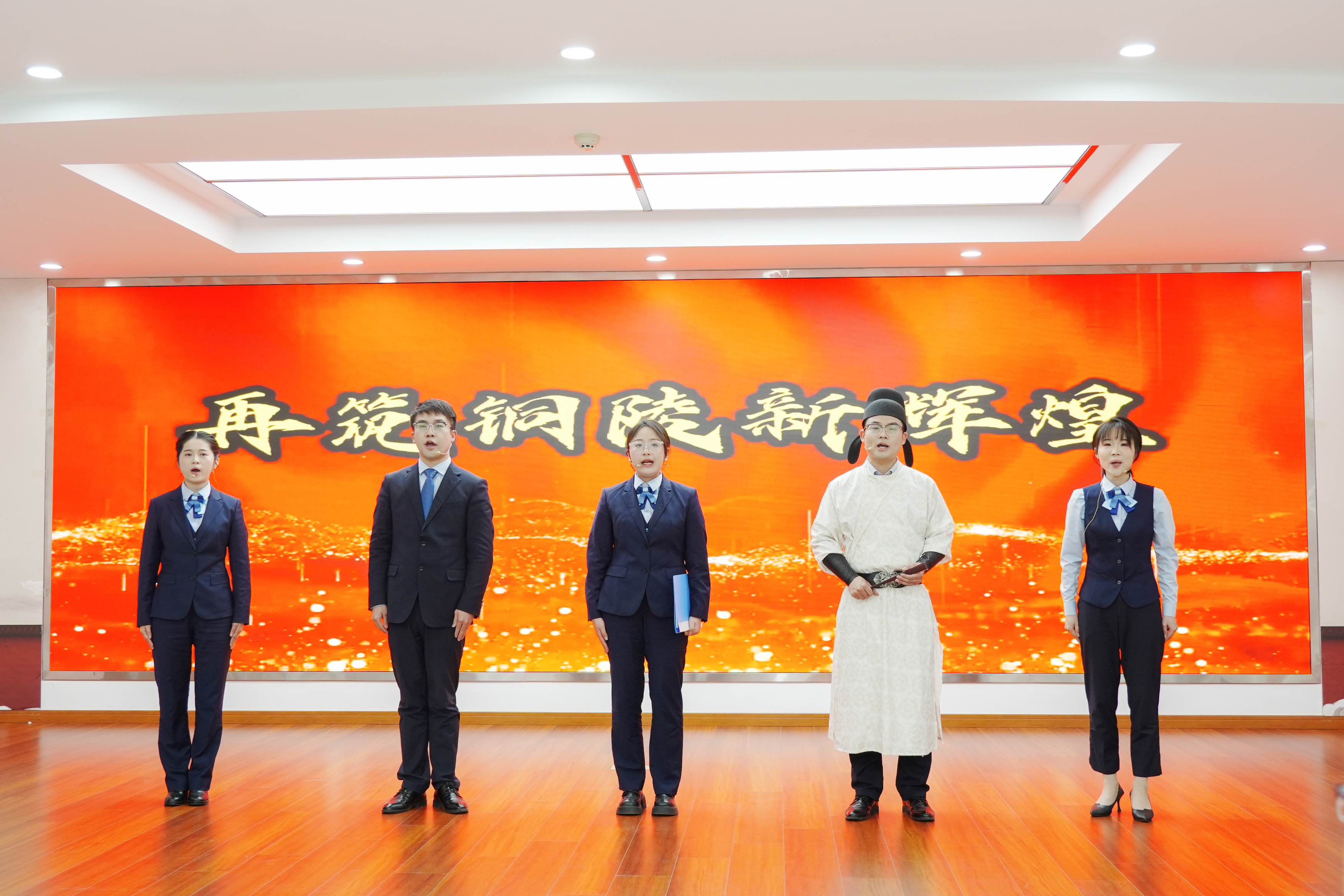 枞阳农商银行党委高度重视,由行团委牵头组织,青年员工踊跃报名参与,选拔优秀员工组成参赛队伍。选手们身着得体服饰,以饱满的精神状态、沉稳大气的台风,深情演绎了原创作品《五松清风•金韵新程》。作品巧妙融合了传统文化的刚正风骨与金融行业的初心使命,将古诗词的韵律之美与金融人的责任担当相结合,字字铿锵、句句深情,既传递了中华传统文化的魅力,也展现了枞阳农商银行坚守金融为民、深耕本土服务的初心与决心。