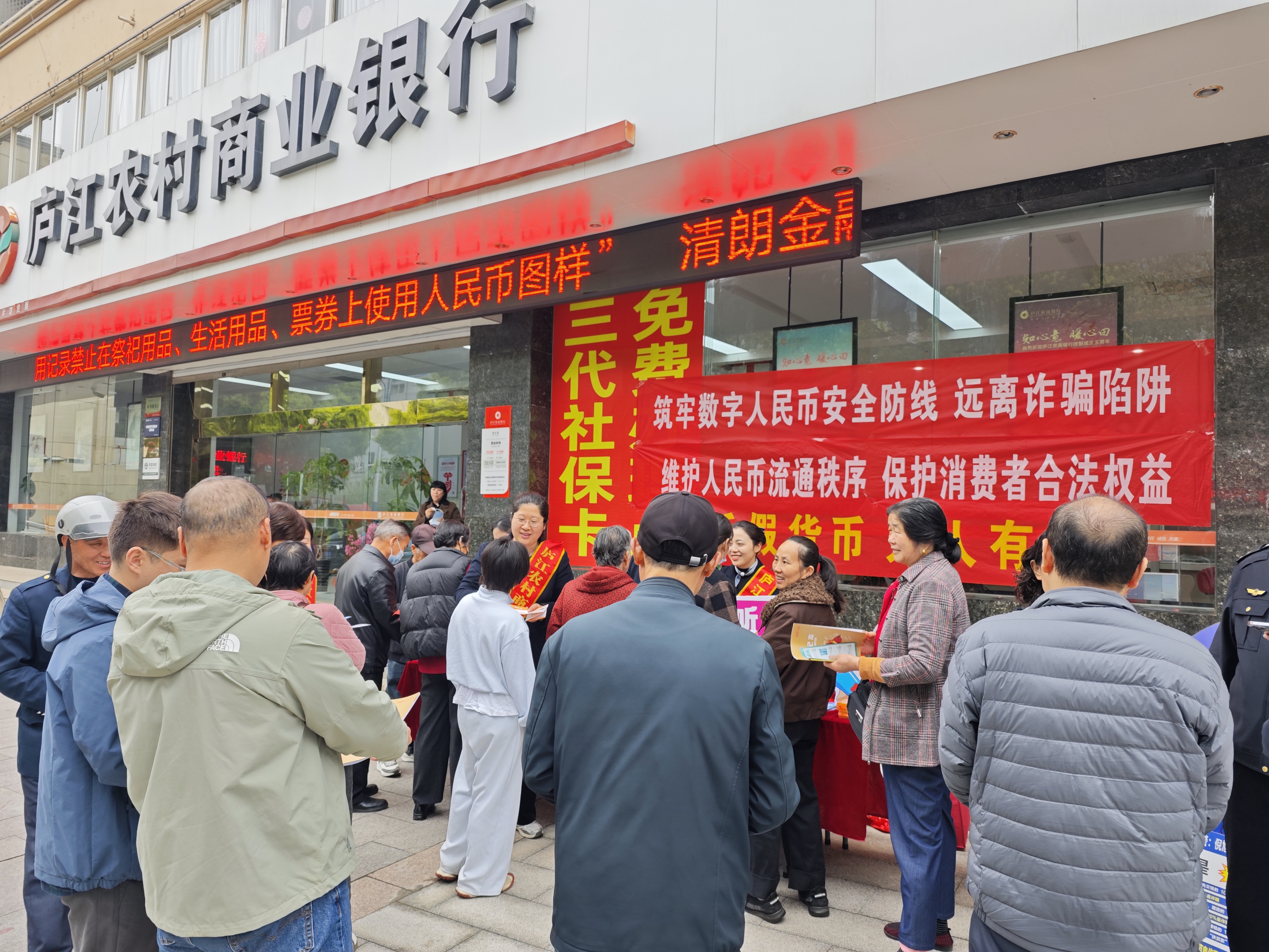 4月3日上午,庐江农商银行联合中国人民银行安徽省分行、巢湖分行及庐城镇派出所等单位,开展“筑牢数字人民币安全防线 远离诈骗陷阱”主题反诈宣传活动。