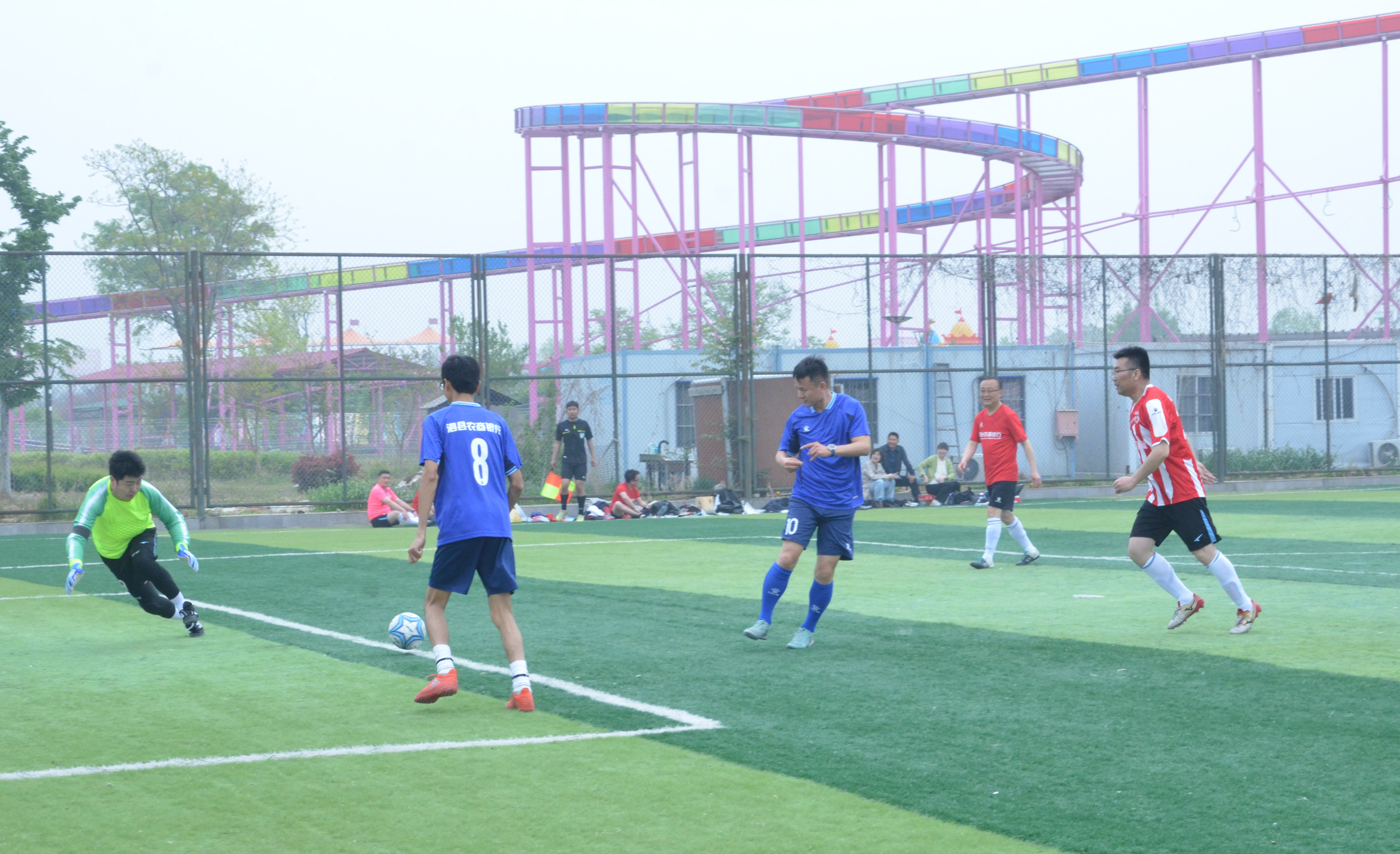 比赛当天,赛程紧凑、战况激烈。上午率先展开小组赛阶段的较量,首场比赛由泗县农商银行对阵宿州农商银行,双方队员迅速进入状态,攻防转换节奏明快,传球、跑位、射门一气呵成。泗县农商银行代表队凭借默契配合与稳定发挥,最终以7:4的比分拿下开门红。随后进行的第二场小组赛中,固镇农商银行与灵璧农商银行展开强强对话,双方队员你争我夺、互不相让。固镇农商银行代表队凭借高效进攻与稳固防守,以3:1的比分战胜对手,与泗县农商银行携手晋级决赛。